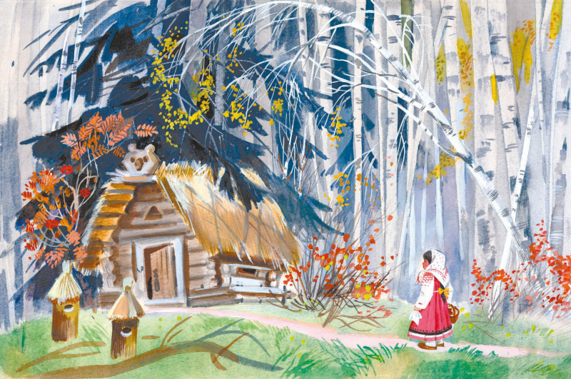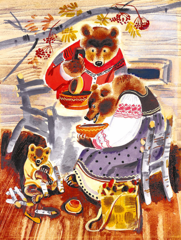 Дверь была отворена; она посмотрела в дверь, видит – в домике никого нет, и вошла. В домике этом жили три медведя. Один медведь был отец, звали его Михаил Иваныч. Он был большой и лохматый. Другой была медведица. Она была поменьше, и звали её Настасья Петровна. Третий был маленький медвежонок, и звали его Мишутка. Медведей не было дома: они ушли гулять по лесу.