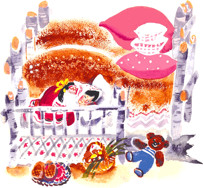 Девочка легла в большую – ей было слишком просторно; легла в среднюю – было слишком высоко; легла в маленькую – кроватка пришлась ей как раз впору, и она заснула.
