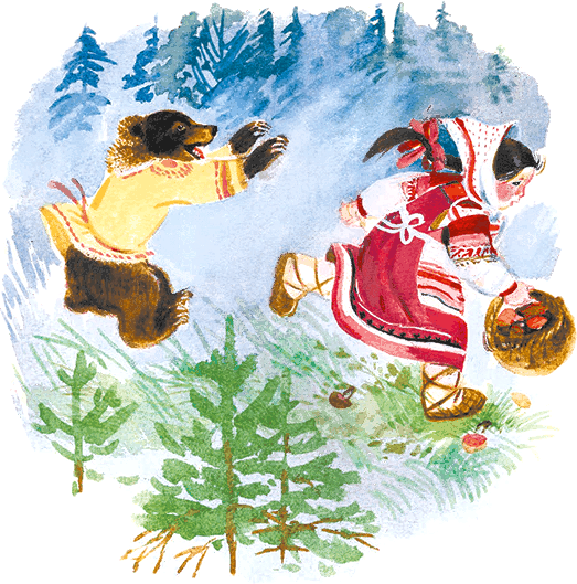 Он хотел её укусить. Девочка открыла глаза, увидела медведей и бросилась к окну. Окно было открыто, она выскочила в окно и убежала. И медведи не догнали её.