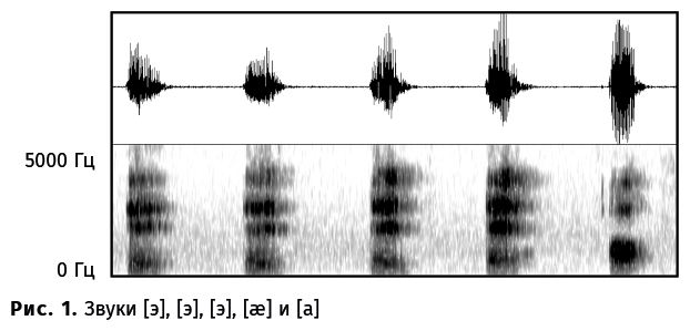 На рис. 1 пять звуков представлены с помощью двух визуализаций. Наверху — осциллограмма, которая показывает амплитуду звуковой волны в целом (время отложено по оси x, амплитуда — по оси y). Внизу — динамическая спектрограмма, которая отображает амплитуду на каждой конкретной частоте в конкретный момент времени (фактически это трехмерный график: время отложено по оси x, частота — по оси y, большей амплитуде соответствует более темный цвет). Легко заметить, что здесь произнесено пять звуков — и все они разные.
