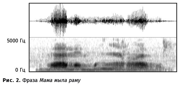 Но и после того, как мы разложили звуки по корзинам, трудности не закончились: мы ведь не говорим с паузами после каждого звука, как на рис. 1, поскольку в этом случае каждая фраза занимала бы уйму времени. Звуки идут сплошным потоком, и разделить звуковую волну на части, соответствующие отдельным звукам, совсем непросто. На рис. 2 изображено произнесение фразы Мама мыла раму. Разрезать его на 12 частей, соответствующих 12 звукам, невозможно; да и слова-то не очень хорошо вычленяются. В таком сплошном потоке звуки разными способами влияют друг на друга — этому посвящены задачи № 2 «Черная кошка, белый кот», № 3 «Солнце и луна», № 4 «Чиабатта и "Главпивмаг"», № 5 «Пятьдесят и семьдесят».
