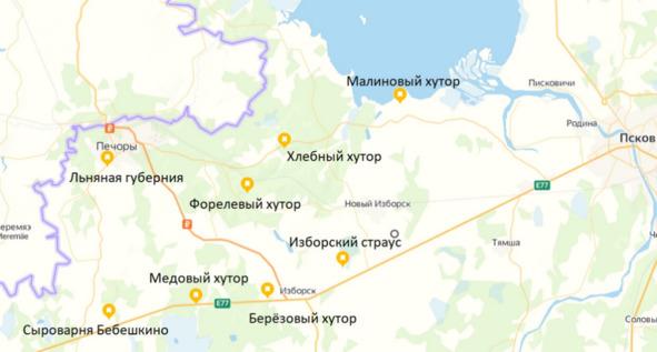 В итоге было разработано несколько туристических маршрутов: «По Печорской стороне», «Изборский тракт» [По Печорской стороне…]. В 2021 году туристический маршрут «С грохотом по фермам, или Глаза страшатся, а руки делают» от турагентства «Континент» вошел в топ-30 лучших туристических маршрутов России по итогам Всероссийского проекта по проектированию концептуальных туристических маршрутов «Открой свою Россию» [ПАИ, 2021]. Если обобщить все маршруты, то в них попадают следующие объекты: «Медовый хутор», «Берёзовый хутор», «Хлебный хутор», «Изборский страус», сыроварня «Бебешкино», музей «Льняная губерния», фермерское хозяйство «Барановское» (более известное как малиновый хутор).