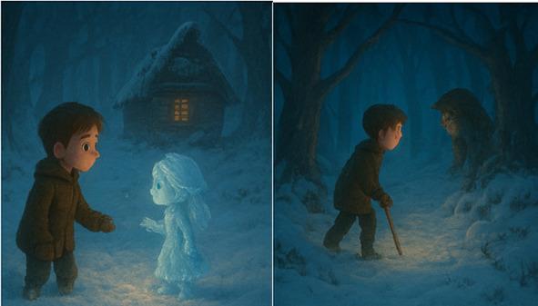 Она бросила зёрнышко в основание ледяной стены. Тут же из земли пророс тонкий, но крепкий зелёный росток. Он потянулся вверх, и там, где он касался льда, злые слова таяли, превращаясь в тихие капли. Стена не рухнула, но в ней появился проход — ровно такой, чтобы мог пройти человек, не таящий в сердце зла. Поучение первое: против стены злых слов не нужна сила или хитрость. Нужна искренность и чистое сердце, чтобы пройти сквозь неё.