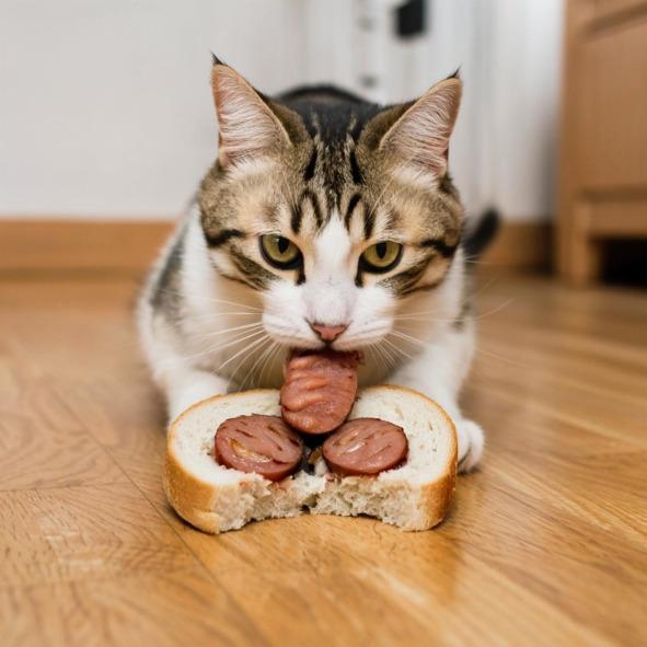 Встревоженный звуком, кот лениво обратил внимание на причину шума и, заметив разбросанную колбасу на полу, тут же спрыгнул с дивана и принялся за хоть и неожиданную, но безумно приятную трапезу.