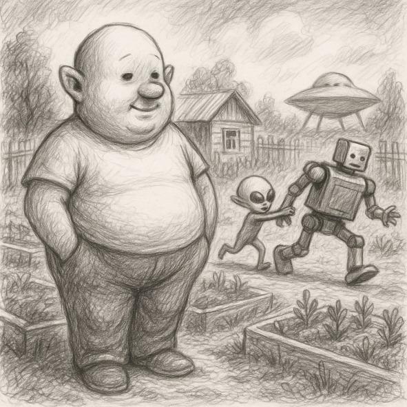 Йонсон прыснул. Инопланетянин тем временем что-то сказал детям и направился в сторону сарая. Ребятишки, оставив игру в куличики, увлечённо принялись перекапывать клубничную грядку своими ярко-красными совочками.