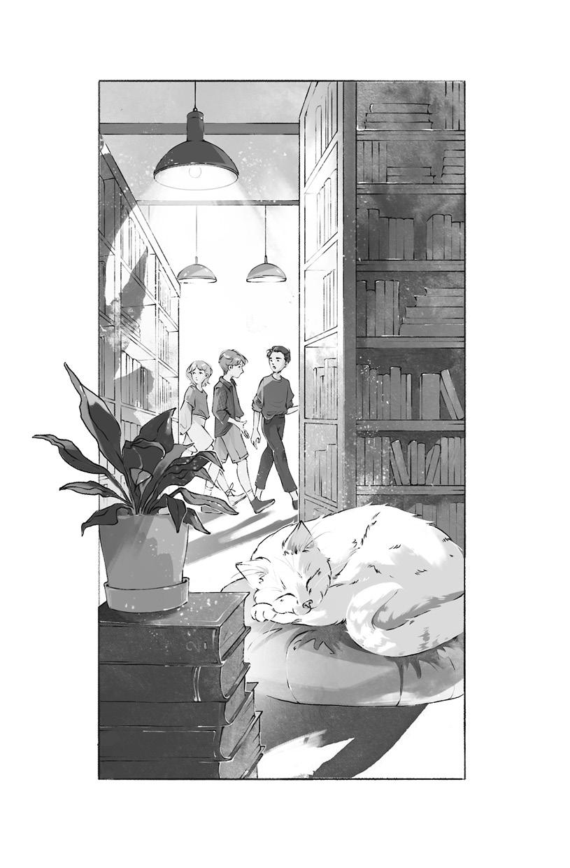 Друзья поймали кота возле полок с приключенческими романами. Они погладили его рыжую шёрстку и отправились бродить среди бескрайних полок, разглядывая обложки.