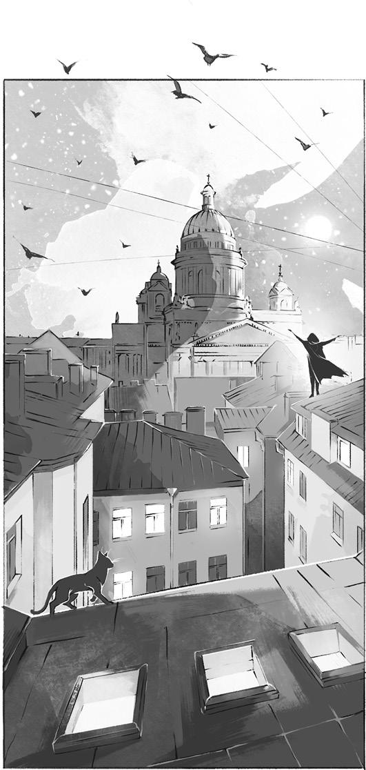 Она держала в руках книгу, которая свалилась на Тима. Только сейчас друзья заметили, какая у неё была красивая обложка: на развалинах здания восседала птица, из крыльев которой струился огонь. Серый, густой туман опустился на город, заслоняя собой солнце. Книга была такая яркая, что глазам становилось больно, если долго смотреть на неё.