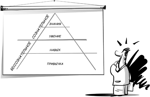 Нижние две части пирамиды относятся к области бессознательного. Это то, что вы делаете на автомате, не концентрируясь на процессе. Например, вы дышите, чувствуете ступнями ботинки, водите глазами по строкам книги. Пока я об этом не сказал, вы не обращали на это внимания, но все равно делали. Это и есть бессознательное применение навыков и привычек.