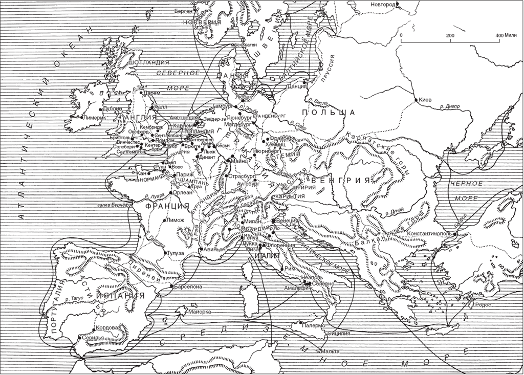 Географическое местоположение, традиции и военные удачи сделали Италию посредником между Востоком и Западом (рис. 7). Амальфи стал почти аванпостом Константинополя; Генуя и другие северные, а также южные города отчасти сохранили хозяйственную деятельность с античных времен; в VI веке к ним присоединилась Венеция – новый город с превосходным расположением как перевалочный пункт между восточным побережьем Средиземноморья и внутренними районами Центральной и Северной Европы. В раннем Средневековье Италия лидировала среди западных стран в сельском хозяйстве, суконной промышленности и большинстве городских форм искусства. После падения Рима восточные жители (известные под общим названием «сирийцы») время от времени торговали, но итальянцы вытеснили их с рынка благодаря медленному распространению в Западной Европе высококачественных товаров с Востока. Больше всего Западная Европа торговала продуктами питания: зерновыми, рыбой, вином и молочными продуктами, без которых население многих регионов жило бы впроголодь. Именно благодаря итальянцам на рынок поступали высококачественные товары. Когда стали открываться ярмарки, вроде Сен-Дени в Париже (к 629 году) или в Труа в провинции Шампань, откуда сухопутный путь вел из Восточной Франции в Геную и Флоренцию, чаще всего именно итальянские купцы покупали сырье или полуфабрикаты на севере. Таких ярмарок, имевших исключительно коммерческое значение в условиях довольно примитивной экономики, стало гораздо больше, когда Европа, оправившись от норвежских вторжений, набрала силу для крестовых походов.