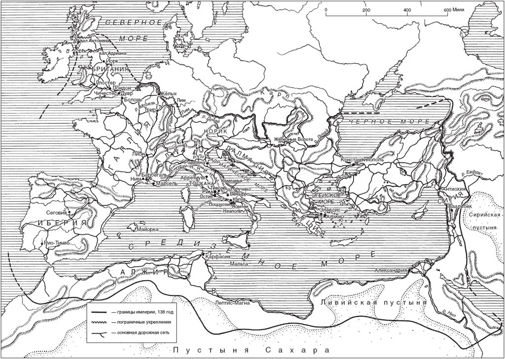 На Средиземноморье 200 лет царил мир (рис. 5). Хотя не удалось удержать в подчинении древние земли Месопотамии за Евфратом, а завоевание Германии к востоку от Рейна или территории современной Румынии к северу от нижнего Дуная оказалось недолгим, самым важным считалась безопасность внутренней области – экономической единицы, равной которой в Европе не было на протяжении периода, отделяющего нас от времен Уильяма Питта-старшего и Джорджа Вашингтона. Тучи над империей сгустились снова во время правления императора-философа, Марка Аврелия Антонина, но золотой век империи окончательно закончился со смертью его сына – императора Коммода, в 192 году н. э.