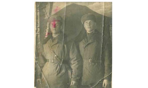 Векшин Александр Иванович, 5 марта 1942 год (слева, рядом с березой)