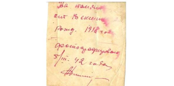 На память от Векшина, рождённого 1918 года, фотографировался 5/Ш-42 года, подпись. В этот день, 5 марта 1942 года родилась первая дочь бабушки Кати и Александра Векшина — Нэлли (моя тётя)