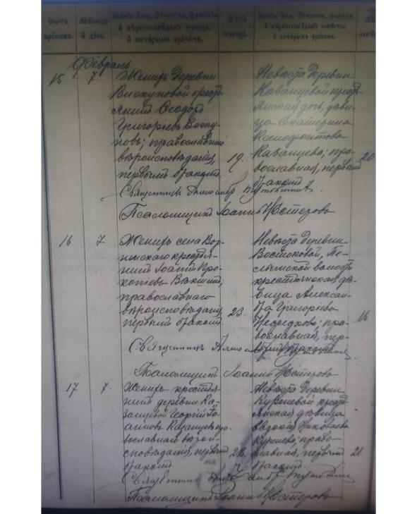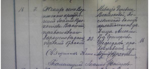 «Жених села Воргинское крестьянин Иоан (Иван) Прокопьев (Прокопьевич) Векшин православного вероисповедания — первым браком 23 года. Невеста деревни Востокова Пелымской волости крестьянская дочь девица Александра Григорьева (Григорьевна) Нефёдова православная первым браком 16 лет. Таинство совершил: священник Александр Тутомиллин, псаломщик Иоан Нестеров.