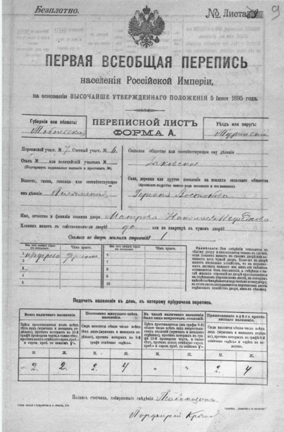 Первая Всеобщая Перепись населения Российской империи на основании высочайше утвержденного Положения 5 июня 1895 года. Тобольская губерний. Туринский уезд, переписной участок №7, счетный участок №6.