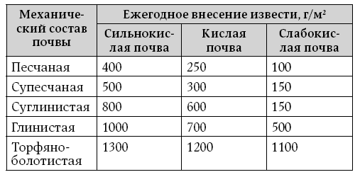 Если почва кислая, её необходимо раскислять с помощью извести. Но следует иметь в виду, что извести требуется разное количество для почв разного механического состава и различной кислотности (табл. 2). Так, глинистые почвы, как уже говорилось выше, богаты минералами. Чтобы растения чувствовали себя нормально на таких почвах, показатель рН должен быть выше 5,5. Торфяники богаты органикой, но почти не содержат минеральных элементов, поэтому их мало в почвенном растворе даже при высокой кислотности почвы, и те же самые растения на торфяниках могут расти при рН 5.