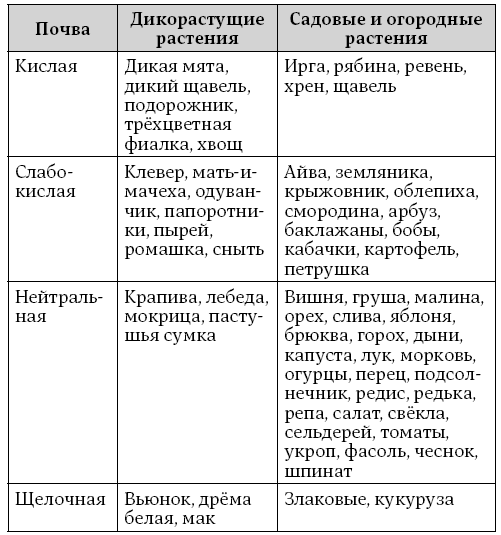 Кислотность почвы можно определить разными способами, например, купить специальный набор лакмусовой бумаги для определения кислотности почв или определить кислотность почвы по растущим на ней диким растениям. Культурные растения так же, как и дикие, предпочитают почвы с определённой кислотностью (табл. 1).