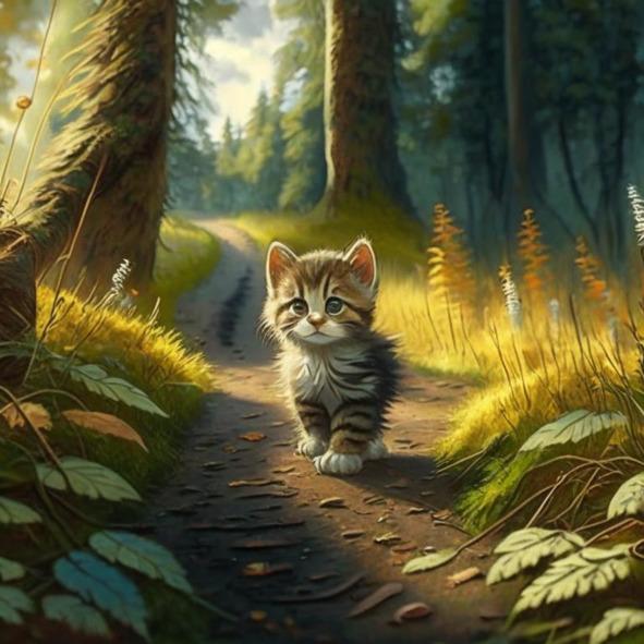 Лето не хотело так быстро сдаваться и продолжало бороться за свои права. Но то и дело срывающиеся листочки с веток деревьев, напоминали о приходе весны. Один из них, покачиваясь из стороны в сторону, тихонько упал прямо перед котёнком на тропу. Лапки остановился, опустил голову и о чём-то задумался. Было нетрудно догадаться, о чём переживал котёнок. Он только что покинул свою мать, братьев и сестёр, чтобы отправиться в путешествие до молочного города.