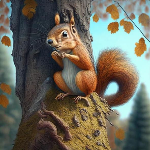 Когда ребята шли по лесу, неожиданно встретили стайку белок, которые прыгали с ветки на ветку. Это были небольшие, бурого цвета зверьки с длинными хвостами и кисточками на ушах. Пенка рассказал Лапки, что белки обычно живут в дуплах деревьев и собирают орехи, так они делают запасы на зиму.