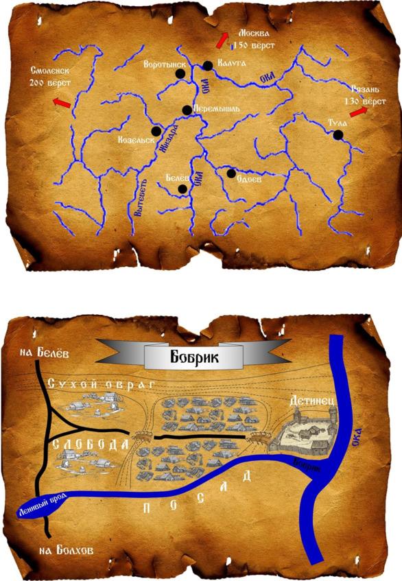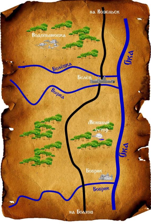 Причин считать свою долю незавидной он имел предостаточно. Отец его, Пётр Иванович, происходил из рода знатного, но обмельчавшего настолько, что Бобриковы владели самой маленькой вотчиной среди всех верховски́х княжеств — земель по обе стороны Оки в её верхнем течении. Столицей служил небольшой городишко: слободка из дюжины дворов, посад на три десятка домов и тесный детинец с обычным пятистенком вместо терема князя[1]. Всё это сгрудилось на вершине каменистого холма с высоким обрывистом склоном. У его подножия в Оку падал мелководный Бобрик. В одном месте он сильно раздавался вширь, из-за чего вода становилась почти неподвижной, и над её поверхностью выступали верхушки камней. Прыгая по ним, можно было пересечь реку не замочив ног, поэтому брод назывался Ленивым. А за ним уже начиналось то самое Дикое поле — первобытный мир, что испокон веку манил русских людей безграничной волей и пугал волчьей лютостью царивших там законов.