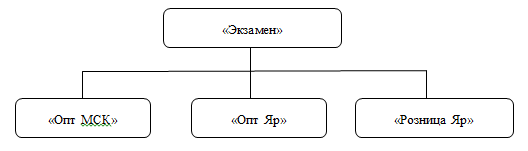 - «Опт МСК». Юридическое лицо. Общая система налогообложения. Занимается централизованной закупкой (за все предприятие «Экзамен») и оптовой торговлей товарами. В организации – 4 подразделения: «Администрация», «Закупки», «Продажи», «Складское хозяйство».