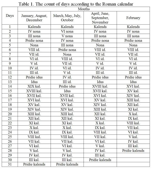 The ancient Romans used a special system for counting days in a given month. The first day of the month was called “calends” (calendae or kalendae). The middle day of the month was called “idus”. The ninth day before idus was called “nona” (nonae), counting inclusively. Initially, calends, nones, and idus roughly coincided with the new moon, the first quarter of the moon, and the full moon, respectively. With time, however, this correlation was broken. Yet the traditional naming of days in this way remained intact for a long time. The day before calends, nones, and idus was called “eve” (pridie). The remaining days were numbered in the reverse order: so many days before nones, idus, or calends. In the leap year, an additional 366th day was inserted between February 23 and 24. It was called “bis sextum kal. Mart” (“twice sixth before the March calends”). The year was called “annus bissextus”, from which the term “bissextile year” or “leap year” is derived.