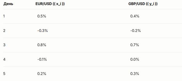 — Вычислите средние: найдите среднее значение изменений для EUR/USD ((\bar {x})) и GBP/USD ((\bar {y})).