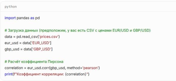 — Интерпретируйте результат: если (r> 0.7), подумайте, как использовать эту корреляцию для парного трейдинга; если (r <-0.7), рассмотрите хеджирование.