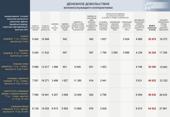 Средний размер денежного довольствия военнослужащих по контракту, замещающих воинские должности рядового и сержантского состава, с учетом всех ежемесячных и иных дополнительных выплат денежного довольствия, возрастает по мере увеличения выслуги лет, должностного уровня, уровня профессионального мастерства, региональных коэффициентов и ежегодной индексации.
