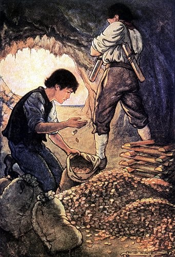 And thereupon we all entered the cave. It was a large, airy place, with a little spring and a pool of clear water, overhung with ferns. The floor was sand. Before a big fire lay Captain Smollett; and in a far corner, only duskily flickered over by the blaze, I beheld great heaps of coin and quadrilaterals built of bars of gold. That was Flint's treasure that we had come so far to seek, and that had cost already the lives of seventeen men from the Hispaniola. How many it had cost in the amassing, what blood and sorrow, what good ships scuttled on the deep, what brave men walking the plank blindfold, what shot of cannon, what shame and lies and cruelty, perhaps no man alive could tell. Yet there were still three upon that island—Silver, and old Morgan, and Ben Gunn—who had each taken his share in these crimes, as each had hoped in vain to share in the reward.