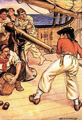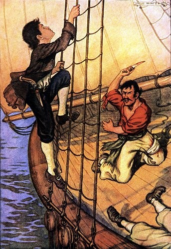 At last, seeing the ship still bore on her course, and was now swiftly drawing out of earshot, one of them—I know not which it was—leaped to his feet with a hoarse cry, whipped his musket to his shoulder, and sent a shot whistling over Silver's head and through the mainsail.