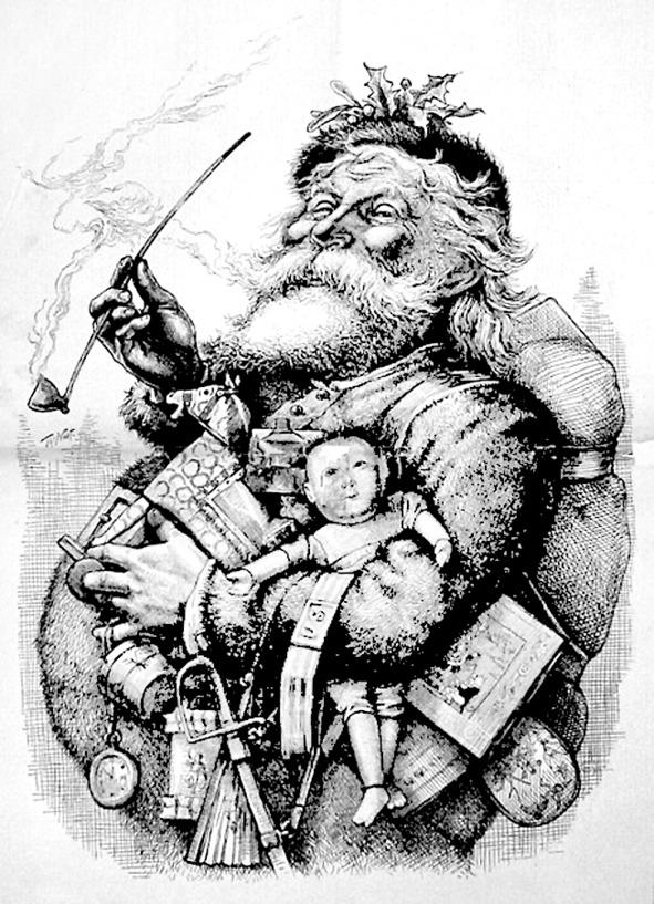 Вослед за содержанием сказки, быстро сформировался и внешний облик Рождественского старичка. Известный американский художник Томас Наст, сотрудничавший с журналом Harper’s Weekly, в 1863 году создал своего зримого Санта Клауса (исходя из сочинения Клемента Мура) в виде политических рисунков. Успех обнадежил его, и он стал рисовать для детей — забавные и веселые сценки из жизни этого дедушки. Так стал формироваться близкий к нашей современности образ.