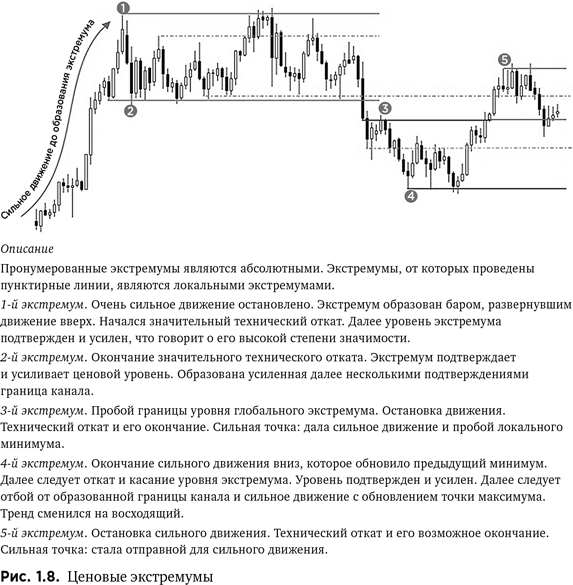 Как уже было сказано, даже трендовое движение происходит не прямолинейно. При сохранении основного направления цена может откатываться в сторону, противоположную основному движению, образуя коррекции. Поэтому принято считать, что тренд — это совокупность последовательно повышающихся ценовых минимумов и максимумов в случае восходящей тенденции и, соответственно, последовательно понижающихся максимумов и минимумов при нисходящей тенденции. Такие достигаемые ценой максимумы и минимумы называют экстремумами. При этом различают глобальные экстремумы — абсолютно максимальные или абсолютно минимальные значения цены, достигнутые и не превзойденные за долгий промежуток времени, и локальные экстремумы — максимальные или минимальные значения цены на средне- и краткосрочном промежутке времени, но не превосходящие по своей величине ценовых значений глобальных экстремумов.