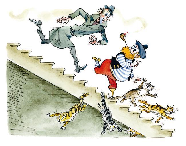 Разбойники схватили вещи и побежали вниз по старой деревянной лестнице так быстро, что подняли ногами целый ураган пыли.