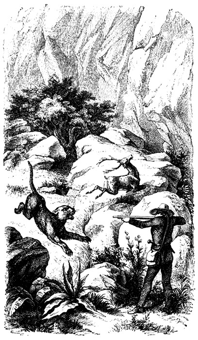 To my surprise I noticed that Trusty did not come up to the fallen buffalo, but rushed past it, loudly barking, to the thicket at the springs, whence I saw an immense panther leap through the prickly plants. I galloped round the ponds and saw the royal brute making enormous leaps through the tall prairie grass toward the mountains. Trusty was not idle either, and was close behind it. I spurred Czar, and kept rather nearer the mountains, so as to cut off the fugitive's retreat and drive it farther out on the plains, while my hunting cry incessantly rang in its ears. It had galloped about a mile, when we got rather close to it; it altered its course once more, and climbed up an old evergreen live oak, among whose leafy branches it disappeared. I called Trusty to heel, stopped about fifty yards from the oak to reload my right-hand barrel, and then rode slowly round, looking for a gap in the foliage through which to catch a glimpse of this most dangerous animal. The leaves were very close, and I had ridden nearly round, when I suddenly saw its eyes glaring at me from one of the main branches in the middle of the tree. I must shoot it dead, or else it would be a very risky enterprise; and Czar's breathing was too violent for me to fire from his back with any certainty. I cautiously dismounted, keeping my eye on the panther, held a revolver in my left hand, brought the bead of my rifle to bear right between the eyes of the king of these solitudes—and fired. With a heavy bump the panther fell from branch to branch, and lay motionless on the ground. I kept Trusty back, waited a few moments to see whether the jaguar was really dead, as I did not wish to injure the beautiful skin by a second bullet unnecessarily, then walked up and found that the bullet had passed through the left eye into the brain. It had one of the handsomest skins I ever took; it is so large that I can quite wrap myself up in it, and now forms my bed coverlet. When I had finished skinning it and cut out the tusks with the small axe I always carried in a leathern case, I rode back to my buffalo, with the skin proudly hanging down on either side of my horse. On getting there I led Czar through the narrow entrance into the thicket, where I came upon a freshly killed, large deer, one of whose legs was half eaten away. It was the last meal of the savage beast of prey, and I was surprised it had left its quarry. The noise of the buffalo and the horse galloping, Trusty's bass voice, and the crack of the revolver in such close vicinity, must have appeared dangerous to it, and it had fancied it could slip off unnoticed.