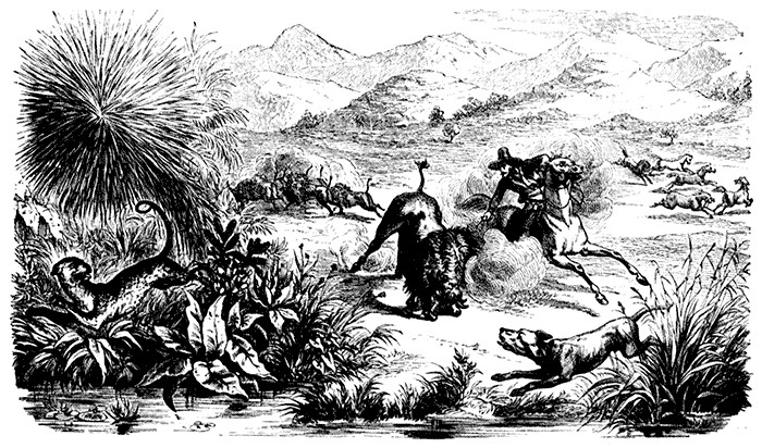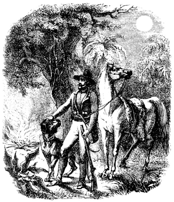 On a spring morning—I need not add a fine one, for at this season the blue sky rarely deserts us for more than a few hours—I rode at daybreak down the river toward the mountains; a cold, refreshing breeze was blowing, which had an invigorating effect upon both men and animals. Czar was full of playfulness. He often pretended to kick at Trusty, his dearest friend, who was trotting by his side, shook his broad neck, and could hardly be held in. Trusty ran ahead, every now and then rolled in the tall grass, kicked up the earth behind him, and then looked up at me with a loud bark of delight. I too was in an excellent humour; the small birds-of-paradise, with their long black and white tails and crimson breasts, fluttered from bush to bush. The humming birds darted past me like live coals, and suddenly stopped as if spell-bound in front of some flowers, whence they sucked the honey for a few seconds with their beaks, and then hummed off to another fragrant blossom. Countless vultures described their regular circles over my head; above them gleamed against the ultramarine sky the brilliant white plumage of a silver heron, or the splendid pink of a flamingo; whilst high up in ether the royal eagles were bathing in the sunshine. The prairie was more beautiful this day than I had ever seen it; it was adorned by every designation of bulbous plants, the prevailing flora in the spring.