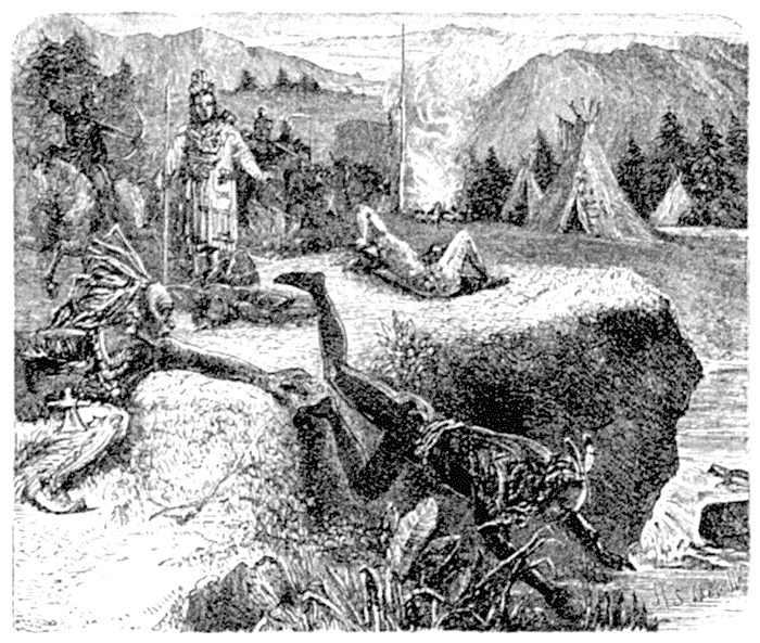 Our cattle were now brought up and fastened to the withered trees in the open space—then we lay down on our skins round the fire and enjoyed the beaver tails, while our hosts paid special attention to our biscuits and coffee, which were a rarity for them. After supper Armstrong sent the whisky-cup round again, then pipes were lighted, and we first answered the thousand questions asked us about the state of affairs at home, and which principally referred to politics. When this subject was exhausted, Armstrong spoke and told us the principal events of his life since he last bade farewell to civilization, his various bloodthirsty fights with the Indians, the dangers they had often escaped with difficulty, and the fatigues and unpleasantnesses they endured, among which he mentioned the hailstorm, which had also annoyed us. He told us of successful hunts with the traps, and promised to show us the next morning the last beaver to be found in these parts.