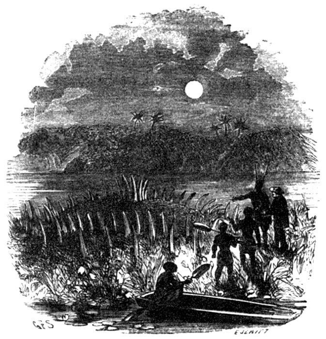 After a very hot spring day I had sought the ponds, as it was too late to ride home. The night was glorious; the magnolias and large-flowered cactuses diffused their vanilla perfume over me; myriads of fireflies continually darted over the plain, and a gallant mocking-bird poured forth its dulcet melody into the silent night above my head. The whole of nature seemed to be revelling in the beauty of this night, and thousands of insects sported round my small camp fire. It was such a night as the elves select for their gambols, and for a long time I gazed intently at the dark blue expanse above me. But, though the crystal springs incessantly bubbled up to the surface, the Lurleis would not visit me, for they have not yet strayed to America.
