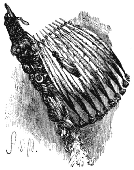 I was riding slowly along a hollow in the prairie, when a rapidly approaching sound attracted my attention. In a few minutes a very old buffalo, covered with foam, dashed past me, and almost at the same moment a Comanche Indian pulled up his horse on the rising ground about fifty yards from me. As he had his bow ready to shoot the buffalo, the savage made his declaration of war more quickly than I, and his first arrow passed through my game bag sling, leather jacket and waistcoat to my right breast, while two others whizzed past my ear. To pluck out the arrow, seize a revolver, and dig the spurs into my horse, were but one operation; and a second later saw me within twenty yards of the Redskin, who had turned his horse round and was seeking safety in flight. After a chase of about two miles over awfully rough ground, where the slightest mistake might have broken my neck, the Indian's horse began to be winded, while Czar still held his head and tail erect. I rapidly drew nearer, in spite of the terrible blows the Redskin dealt his horse, and when about thirty paces behind the foe, I turned slightly to the left, in order, if I could, to avoid wounding his horse by my shot. I raised my revolver and fired, but at the same instant the Indian disappeared from sight, with the exception of his left foot, with which he held on to the saddle, while the rest of his body was suspended on the side away from me. With the cessation of the blows, however, the speed of his horse relaxed, and I was able to ride close up. Suddenly the Indian regained his seat and urged on his horse with the whip; I fired and missed again, for I aimed too high in my anxiety to spare the mustang. We went on thus at full gallop till we reached a very broad ravine, over which the Indian could not leap. He, therefore, dashed past my left hand, trying at the same moment to draw an arrow from the quiver over his left shoulder. I fired for the third time; with the shot the Comanche sank back on his horse's croup, hung on with his feet, and went about a hundred yards farther, when he fell motionless in the tall grass. As he passed me, I had noticed that he was bleeding from the right chest and mouth, and was probably already gone to the happy hunting-grounds. I galloped after the mustang, which soon surrendered, though with much trembling, to the pale face; I fastened its bridle to my saddle bow, led both horses into a neighbouring thicket, and reloaded my revolver.