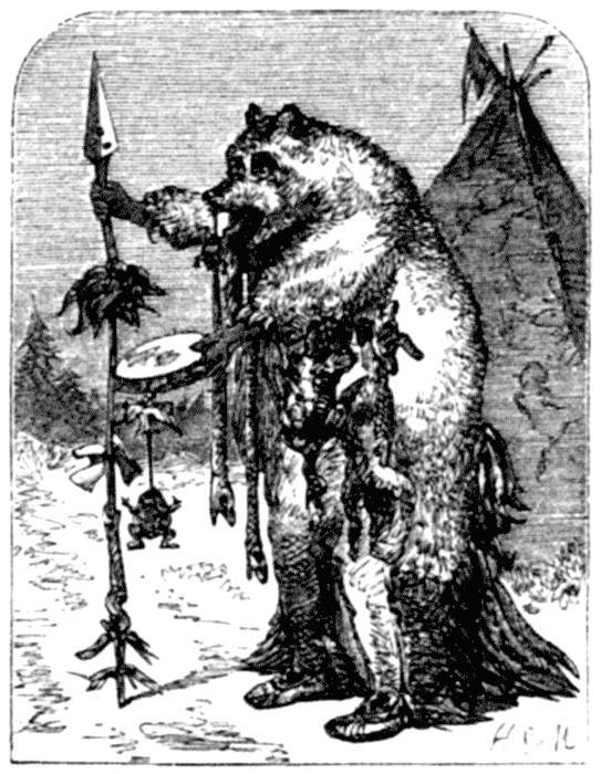 These beasts are often found on the Rocky Mountains, where they are very numerous, as the hunters do not care to pursue them. Everybody is glad to get out of their way, and only uses weapons against them when he is attacked, or can fire at them from a place of safety, such as a boat on a river, when the bears are on land, or from a stout tree. The Indians also only fight them in self-defence, and hence their claws are considered the greatest mark of honour with which they can adorn themselves. The value of a grizzly stands in no proportion to the danger the hunter incurs in pursuing it, for its hide is too heavy, and its hair not so fine as that of the black bear: it never becomes so fat as the latter, and its flesh is not so delicate. Hence people are glad to avoid it, and the hunter willingly surrenders his booty to it, when on following the bloody track of a head of game he runs a risk of being caught up by the grizzly. This animal does not know what fear is, and once irritated it will fight and hit as long as it is able. I know instances in which a grizzly had some thirty bullets in its body ere it was killed; but if hit at the right spot, it falls as easily as any other animal. The she-bear gives birth, from November to January, to two or four cubs, which soon follow it on its forays, and are trained to hunt, which speedily develops the savage, cruel qualities of the young monsters. It hunts both in the mountains and on the prairies: in the former it lays in wait for the game, and darts down from the rocks on its unhappy victim, while on the latter it will chase its terrified quarry for miles, and mercilessly rend it when captured; for instance, it seizes buffaloes, horses, wild cattle, &c., at full gallop by the hocks, tears out the sinews, and in a second renders them incapable of flying farther. When caught quite young and trained, these animals become very tame, but they must never be trusted, as any negligence may cost one's life, and I knew several instances on the frontier of men being torn by such tamed bears, or at least losing an arm or a leg.