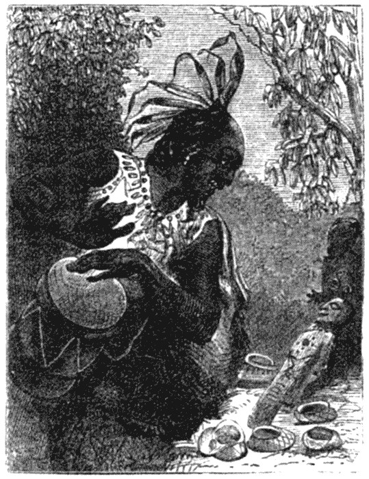 It was the afternoon when we rode down to the river-side and waded through the stream. For the stranger this river is most beautiful and charming, for at its greatest depth it is so clear, that, were it not for its motion and the leaves, brushwood, &c., floating on it, it would be doubtful to say whether it contained any water or not. This is noticed more especially with horses which have to cross such a stream for the first time; generally they object, and look down at the water, whose depth they are unable to gauge. You see the stones at the bottom as clearly as if there were no water, and can distinctly watch the slightest movements of the countless fish and turtle with which the streams in my neighbourhood swarm. At the same time the banks are covered with the most luxurious vegetation, and the gigantic vines cross it from the tops of the trees, and are in their turn intertwined with other creepers so as to form a hanging wood over the darting waters. Most of these creepers adorn the woods with a magnificent show of flowers, and some trees are so overgrown with them, that none of their own foliage is visible. The stream in these rivers is so violent that it is very dangerous to ride through them, especially at spots where the water is deep enough to reach the horse's girths, and the danger is heightened by the extremely slippery soap stones which cover the bottom.