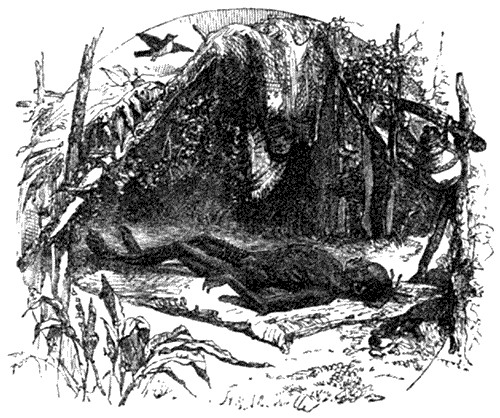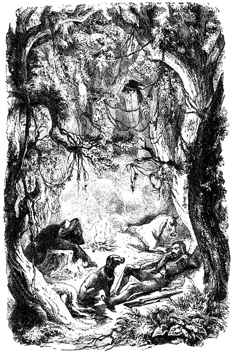 As I mentioned, my fort stood on the south side of the Leone river, and in front of it lay one of the richest and most fertile prairies, which ran to the bank of Mustang Creek, a small stream running parallel to the Leone, beneath the shade of lofty peca-nut trees, magnolias, cypresses, and oaks, to join the Rio Grande. The prairie between the Leone and this stream was about five miles broad; and often, when I had spent the day at home, I rode off to pass the night there, in order to shoot at daybreak as much game as my horse could comfortably carry, and be back to breakfast. I had found, in a coppice close to the stream, a small grassy clearing, where Czar was always comfortable. Around it stood colossal primæval oaks and magnolias, in whose shade many varieties of evergreen bushes, such as myrtle, laurel, and rhododendron, formed an impenetrable thicket, as they were intertwined with pendant llianas and vines the thickness of my body. In this thicket I had built a sort of hut of buffalo hides, in which I hid away a frying-pan, an old axe, and a coffee-pot. At this spot I passed many a hot summer night, for I found there a cool, quiet bed, which the sun never reached, for myself and my faithful companions, and ran no risk of being betrayed by my camp-fire and disturbed by the Indians.