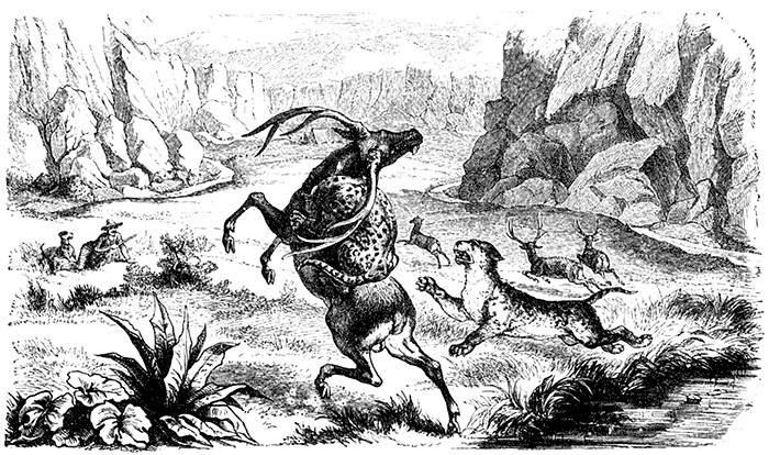 In a week we crossed the valley by short stages and again reached the loftier mountains. One afternoon we arrived at a stream where we resolved to pass the night, as we did not know whether we should find water farther on. Tiger at once hastened off to look for game, and as my comrades preferred a rest, I set out to try my luck too. I told Antonio to follow me on Lizzy, that I might not have to carry the game myself, and had got about a mile from camp when I noticed from a clump of oaks a herd of deer on a grassy spot ahead of me, which looked like the ordinary Virginia deer, but were darker-coloured. I took up a deer-call to draw them toward me, as the spot where I was standing was too barren for me to be able to stalk them. I posted myself near an oak, and Antonio sat on Lizzy behind me. The herd advanced toward me on hearing my call, and were near enough when Antonio cried to me, "Here! here!" I fancied he was alluding to the approaching deer, and whispered that I could see them; but he repeated his "here!" and presently added, "Look to your right!" I turned and saw an enormous snow-white bear forty yards from me, I tried to fire, but the bear got behind a large oak, and then behind another, and so was a good distance off ere I could despatch a bullet after it, which I heard enter a tree. It escaped me, as I had left Trusty in camp, for his feet were sore from running over sharp stones lately. The bear heard the call and hurried up, believing that there was booty for it. It was only a variety of the common black bear. I would gladly have secured its beautiful skin, as it is a rarity, but it was out of my reach, and hence I returned to the deer, which after my shot had disappeared in a distant wood. I went after them, and found them grazing again: when I emerged from the bushes I shot a large deer, and found to my surprise that it belonged to a genus I had never seen before. It was of a very dark, almost black, colour, much larger than a Virginia deer, and more lightly built, with a longer black scut. It had cast its antlers, and the new ones had already grown to some size. We packed the entire animal on Lizzy, and carried it to camp, where Owl called it a mule-stag or black-tail deer, a variety not uncommon in the lower regions of the Rocky Mountains.