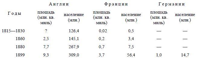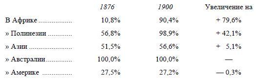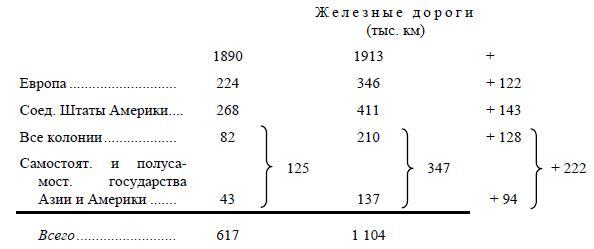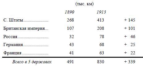 Быстрее всего растет капитализм в колониях и в заокеанских странах. Среди них появляются новые империалистские державы (Япония). Борьба всемирных империализмов обостряется. Растет дань, которую берет финансовый капитал с особенно прибыльных колониальных и заокеанских предприятий. При разделе этой «добычи» исключительно высокая доля попадает в руки стран, не всегда занимающих первое место по быстроте развития производительных сил. В крупнейших державах, взятых вместе с их колониями, длина железных дорог составляла: