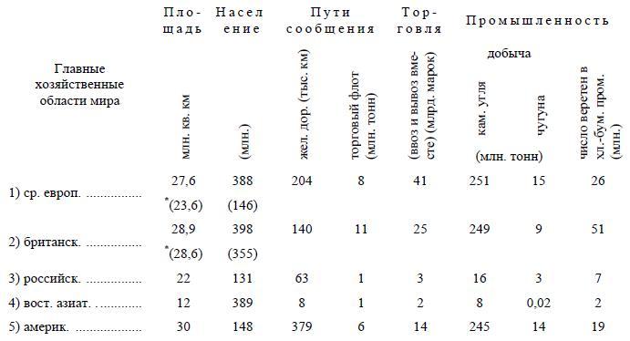 Р. Кальвер в своей небольшой книжке «Введение в всемирное хозяйство»[*] сделал попытку свести главнейшие чисто экономические данные, позволяющие конкретно представить взаимоотношения внутри всемирного хозяйства на рубеже XIX и XX веков. Он делит весь мир на 5 «главных хозяйственных областей»: 1) среднеевропейская (вся Европа кроме России и Англии); 2) британская; 3) российская; 4) восточно-азиатская и 5) американская, включая колонии в «области» тех государств, которым они принадлежат, и «оставляя в стороне» немногие, нераспределенные по областям, страны, например, Персию, Афганистан, Аравию в Азии, Марокко и Абиссинию в Африке и т. п.