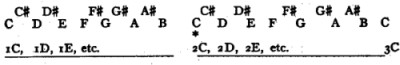 there is a break in the succession, and the tuner goes back to middle C from which he started and tunes by fifths downward until he reaches the G♯ at which he left off. This system employs the tones from F below middle C to C, octave above. Below is the succession, starting upon 3C, whose pitch is determined as usual.