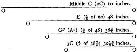 C, G, D, A and E; it being necessary to go over these fifths before we can make any tests of the complete major chord or even the major third. Now, just for a proof of what has been said about the necessity of flattening the fifths, try tuning all these fifths perfect. Tune them so that there are absolutely no waves in any of them and you will find that, on trying the chord G-C-E, or the major third C-E, the E will be very much too sharp. Now, let your E down until perfect with C, all waves disappearing. You now have the most perfect, sweetest harmony in the chord of C (G, C, E) that can be produced; all its members being absolutely perfect; not a wave to mar its serene purity. But, now, upon sounding this E with the A below it, you will find it so flat that the dissonance is unbearable. Try the minor chord of A (A-C-E) and you will hear the rasping, throbbing beats of the too greatly flattened fifth.
