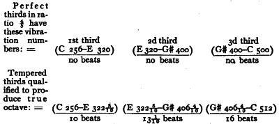 ratio of 2 to 1. If these two strings vary from this ratio to the amount of one vibration, they will produce two beats. Two strings sounding an interval of the fifth vibrate in the ratio of 3 to 2. If they vary from this ratio to the amount of one vibration, there will occur three beats per second. In the case of the major third, there will occur four beats per second to a variation of one vibration from the true ratio of 5 to 4. You should bear this in mind in considering the proper number of beats for an interval, the vibration number being known.