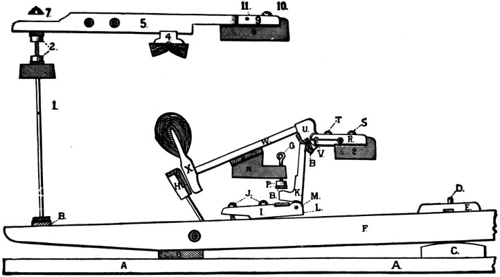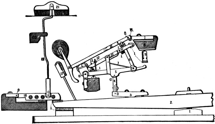 bottom where the extension rests has no hole but simply a felt covering upon which the extension rests; in this case it is necessary to provide what is called an extension guide which is hinged to the extension guide rail shown in the cut at the left of the extension. In actions of this kind, the extensions remain in place at all times and the trouble of placing them properly on the bottom when replacing the action is obviated. Other methods also are employed which are readily understood upon slight examination, but are essentially similar to the above. Instead of the bottom, a capstan screw is used in some actions as follows: