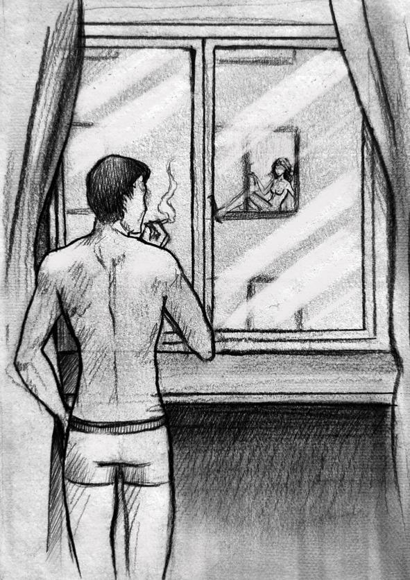 Я снова затягиваюсь горьким дымом, откашливаюсь и вижу, как она расстилается на подоконнике, смотрит в окно и о чем-то думает. А может она также украдкой смотрит на меня и разговаривает сама с собой? Ну вот, наконец, к ней подходит ее ухажер, и мои мечтания рассыпаются в прах. Кажется, будто он на нее кричит. Она с недовольной миной показывает ему, мол подожди еще минутку. Потом открывается окно ее комнаты, и теперь она, действительно, обращается ко мне.