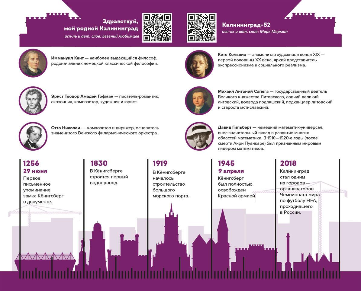Родился Иммануил Кант, один из величайших умов человечества, автор «Критики чистого разума», философ, разработавший «категорический императив» – то есть безусловную норму, которую нельзя нарушать. Одна из его формулировок звучит следующим образом: «Относись к человечеству и в своем лице, и в лице всякого другого не только как к средству, но и как к цели». Кант прожил в городе 79 лет и был похоронен в 1804 г. у кафедрального собора в профессорском склепе.